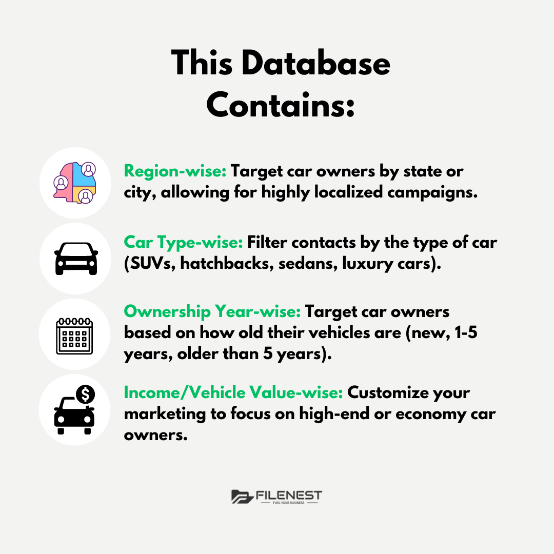 • Instant Access: Download the database immediately after purchase and start reaching car owners right away.